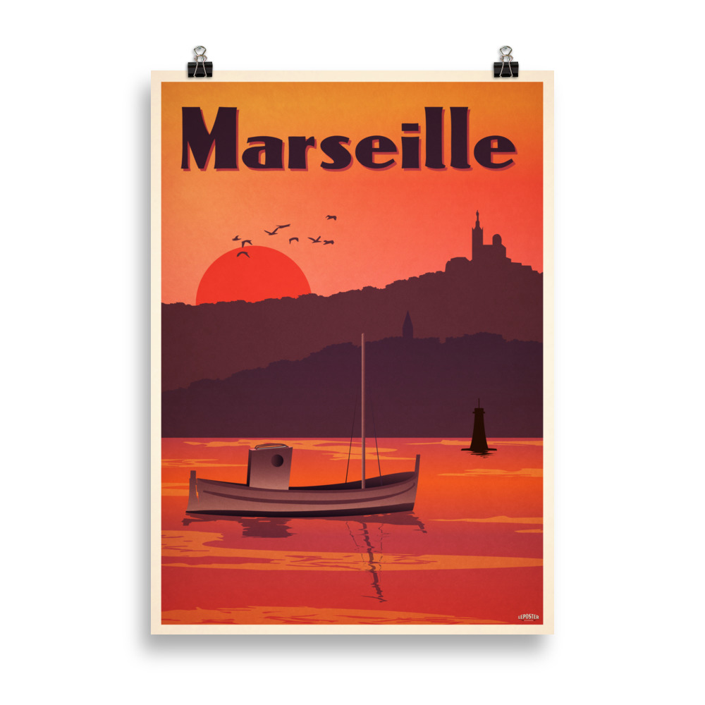 Les couleurs chaudes et le style rétro évoquent la douceur de vivre marseillaise, entre traditions maritimes et beauté méditerranéenne.