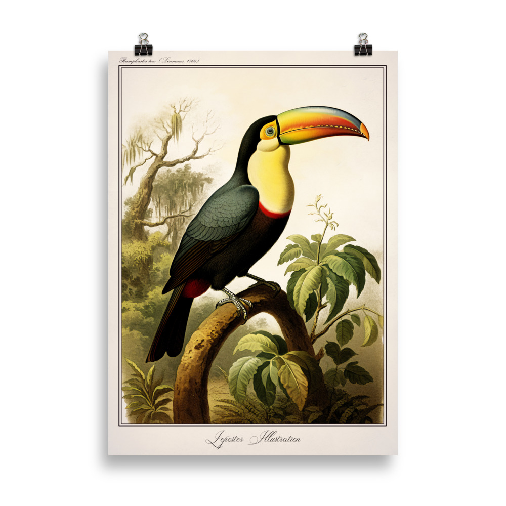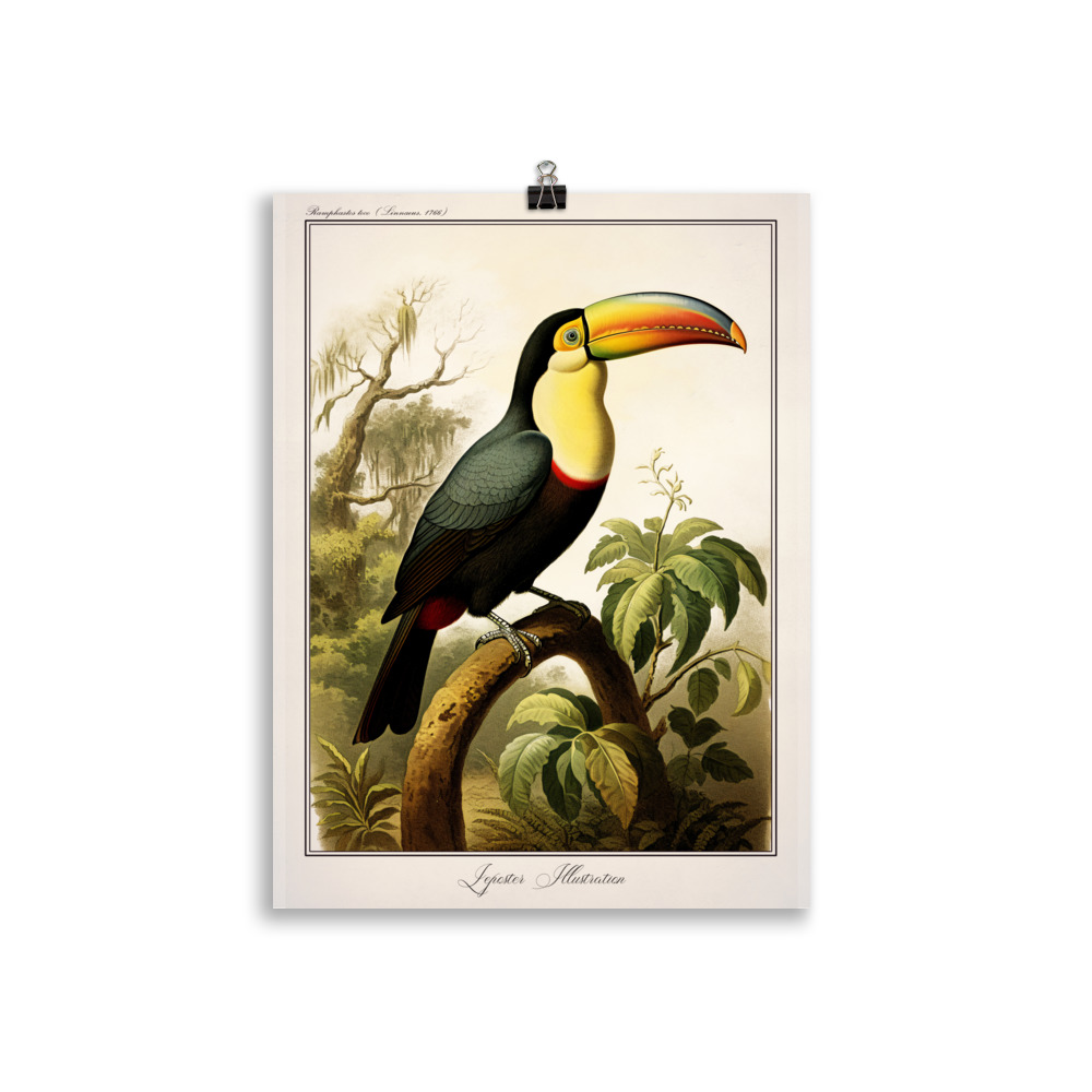 Découvrez la majesté de la nature tropicale avec notre affiche vintage mettant en vedette le « Toucanus Elegans. » Capturant l’essence exotique de cette espèce fascinante, notre affiche est un hommage à la richesse de la biodiversité. Apportez une touche d’élégance et d’aventure à votre décoration intérieure avec cette illustration naturaliste du toucan, parfaitement adaptée aux amateurs de la faune et de la botanique. Accrochez cette œuvre d’art chez vous et laissez-vous emporter dans les contrées lointaines de la forêt tropicale.