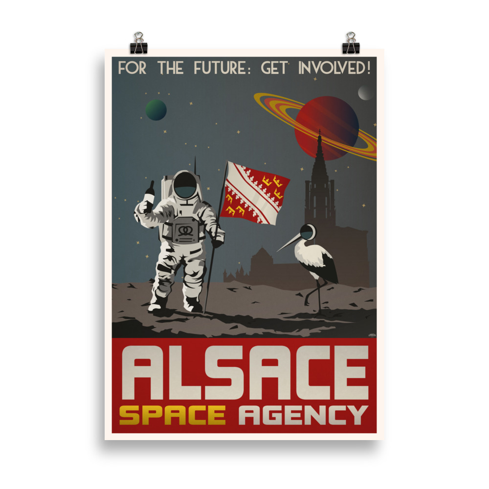 L’affiche Vintage « Alsace Space Agency » est illustration au style propagande retro. Ce poster de qualité ajoutera un merveilleux accent à votre chambre et à votre bureau et vous fera voyager à travers les galaxies en compagnie des pionniers Alsaciens de la conquête spatiale.