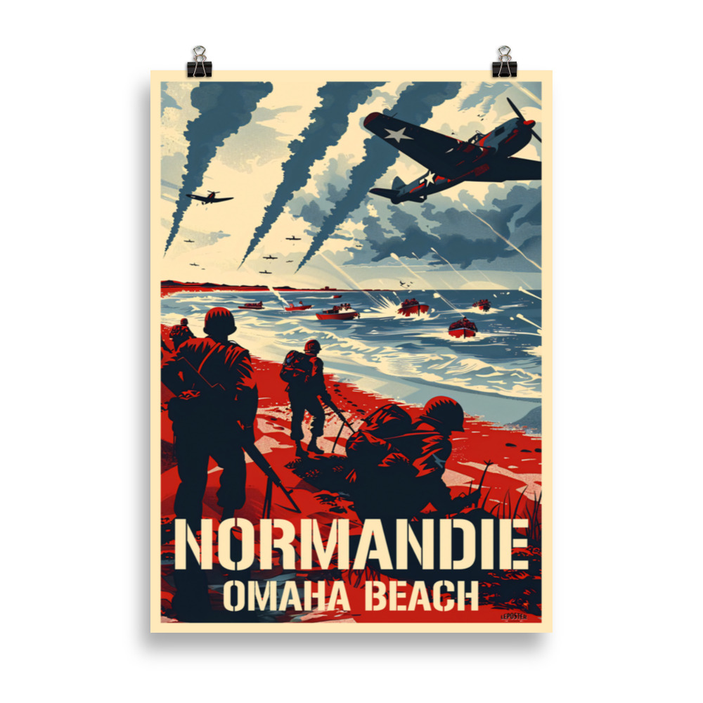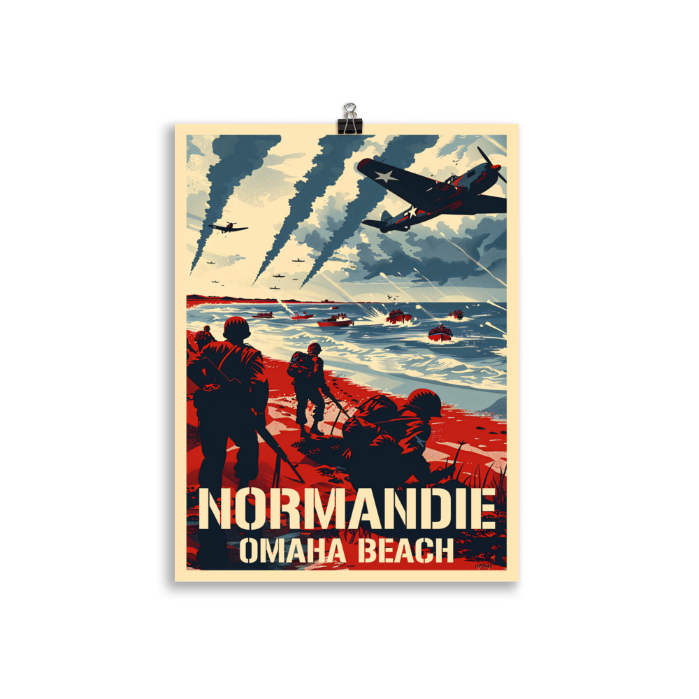 L’affiche « Normandie, Omaha Beach » est une illustration vintage saisissante représentant le débarquement historique de Normandie. Ce poster de qualité apportera un accent mémorable à votre chambre ou votre bureau, vous transportant visuellement sur cette plage emblématique de l’histoire mondiale.