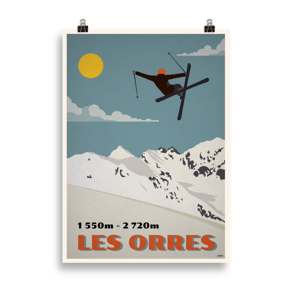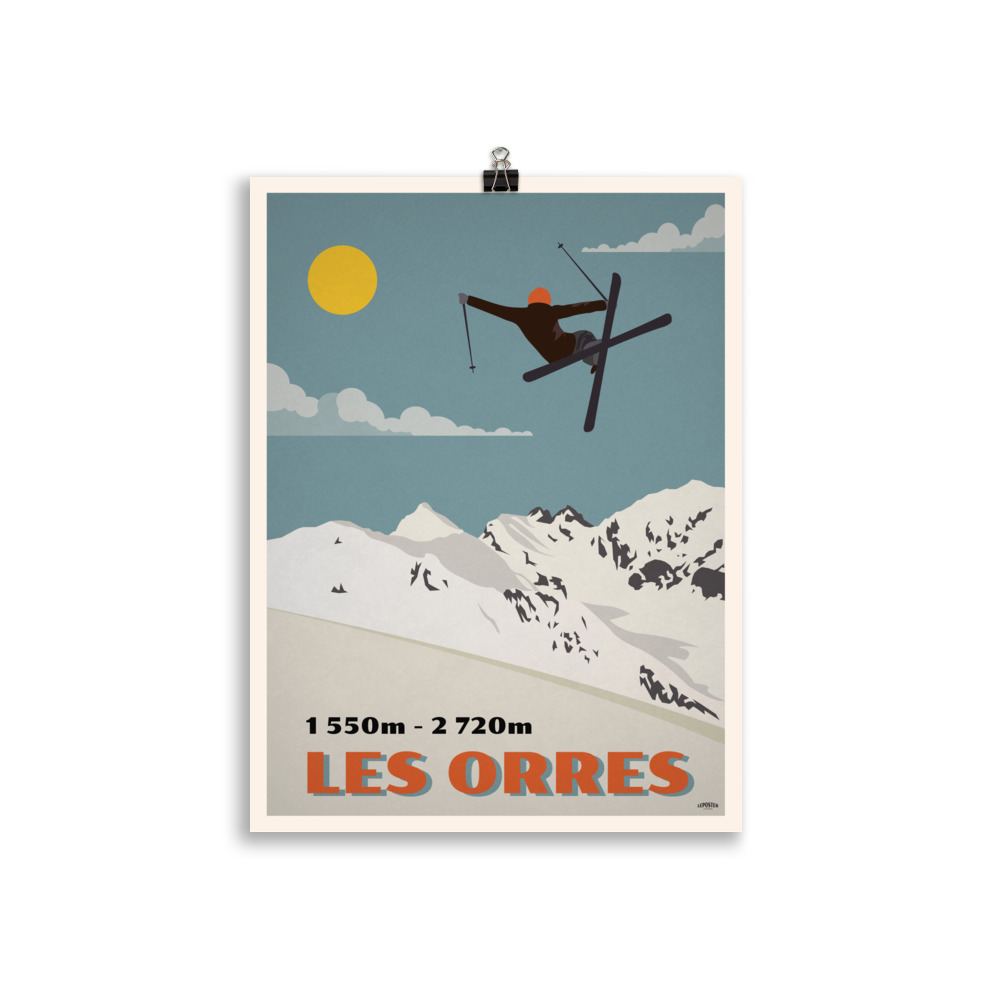 Poster Vintage « Les Orres; Ski Freestyle » est une illustration aux caractère vintage. Ce poster de qualité ajoutera un merveilleux accent à votre chambre et à votre bureau et vous fera voyager dans la magnifique station des Orres.