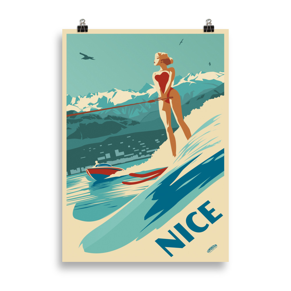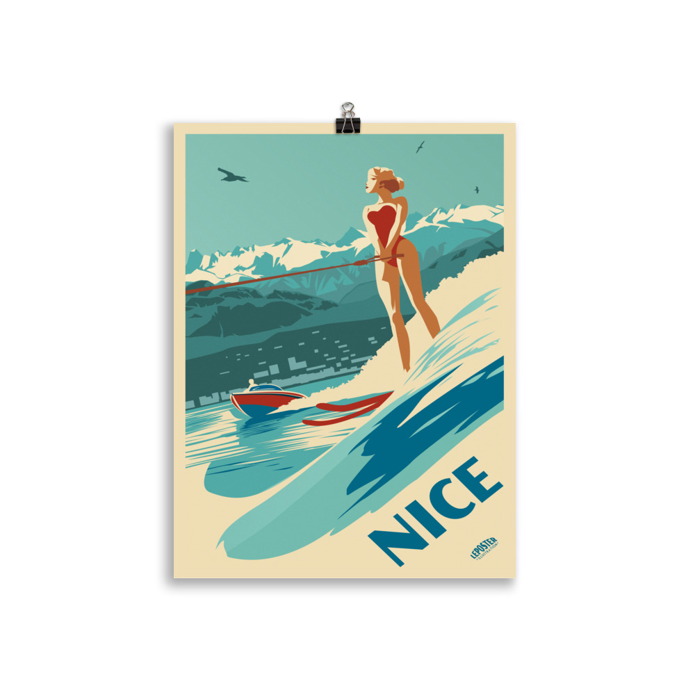 Apportez une touche de glamour rétro et d’évasion méditerranéenne à votre intérieur avec ce poster « Nice Ski Nautique », une célébration artistique du soleil, de la mer et de l’élégance des années 50.