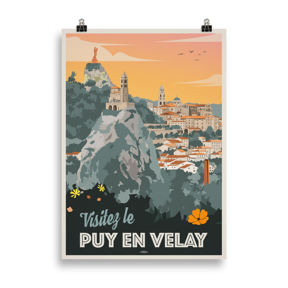 Le Poster Vintage « Puy-en-Velay » met en lumière l’un des sites les plus emblématiques d’Auvergne, revisité avec l’élégance graphique et les formes géométriques du style Art Déco. L’affiche représente la ville perchée du Puy-en-Velay, dominée par ses monuments iconiques : la statue de Notre-Dame de France, la chapelle Saint-Michel d’Aiguilhe juchée sur son piton volcanique, et la cathédrale qui surplombe les toits aux teintes chaudes. Les lignes stylisées, les aplats de couleurs contrastées et les motifs décoratifs typiques de l’Art Déco apportent une touche raffinée et moderne à cette scène patrimoniale.