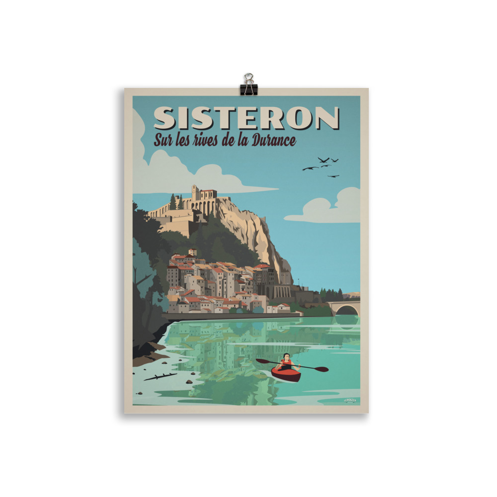 Le Poster Vintage « Sisteron, sur les rives de la Durance » met en scène la beauté spectaculaire de cette ville emblématique de Haute-Provence, sublimée par l’esthétique élégante et géométrique du style Art Déco. L’affiche représente un kayak glissant sur les eaux calmes de la Durance au premier plan. En arrière-plan, la silhouette de Sisteron se dessine avec sa citadelle perchée et ses falaises caractéristiques, stylisées en lignes nettes et formes harmonieuses. Les aplats de couleurs contrastées et la lumière méridionale donnent à l’ensemble une atmosphère dynamique, lumineuse et résolument rétro.