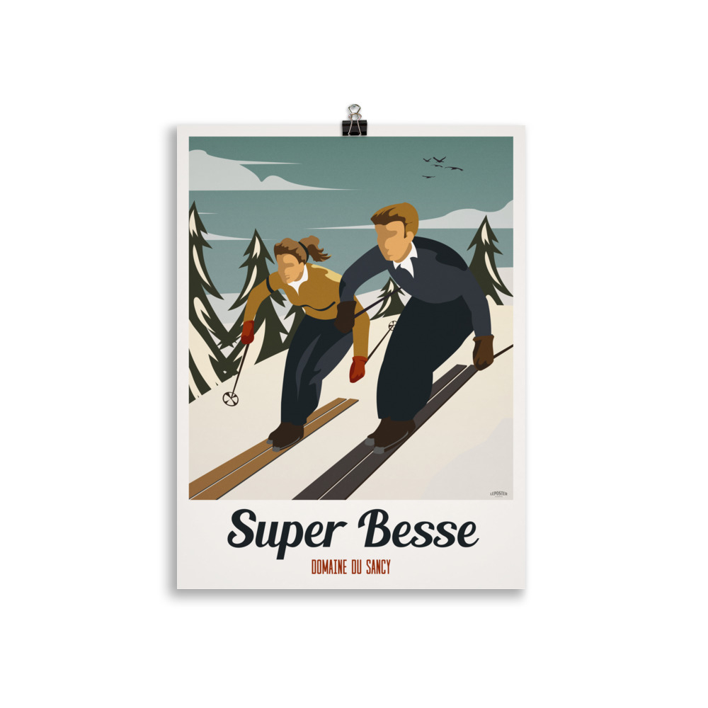 Le Poster Vintage « Super Besse » célèbre l’esprit des sports d’hiver avec élégance et dynamisme dans le style géométrique et raffiné de l’Art Déco. L’affiche représente un couple de skieurs de la Belle Époque, habillés de tenues rétro, glissant côte à côte sur les pistes enneigées. Les montagnes de Super Besse se dessinent en arrière-plan avec des formes stylisées et des lignes épurées, tandis que des couleurs contrastées et des motifs décoratifs apportent modernité et sophistication à l’ensemble.