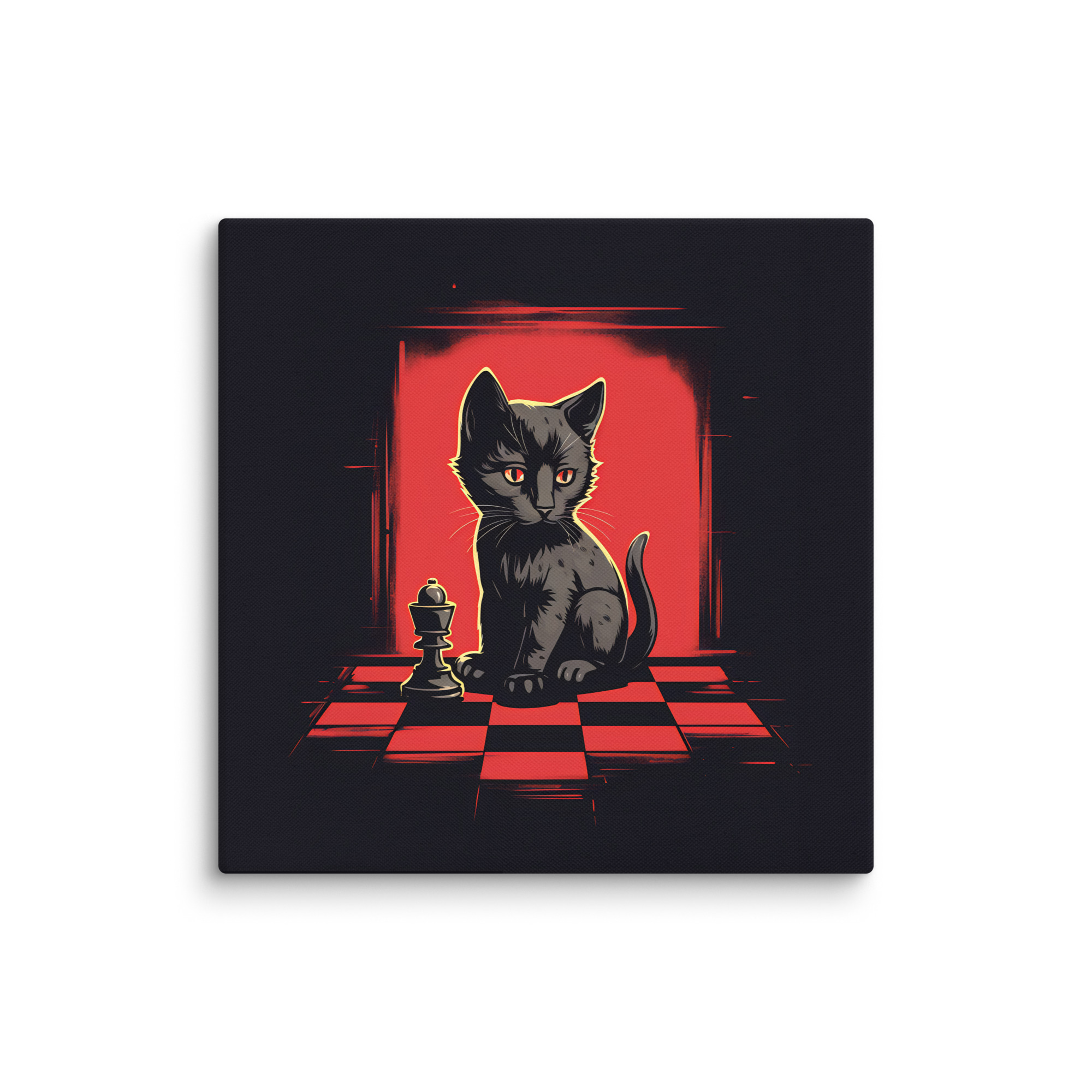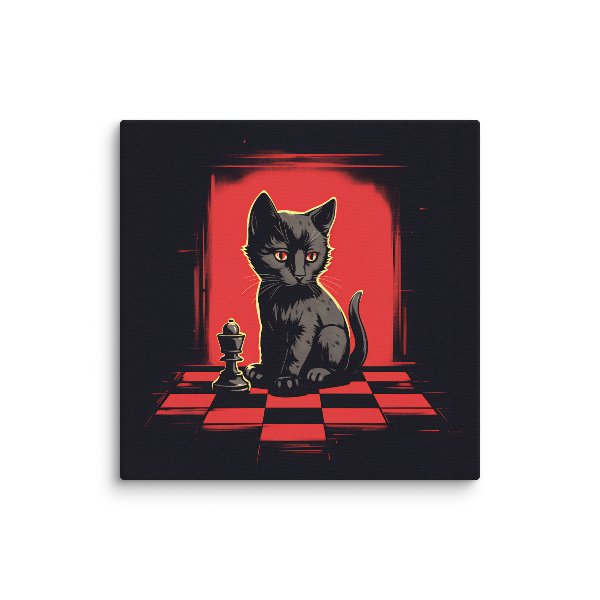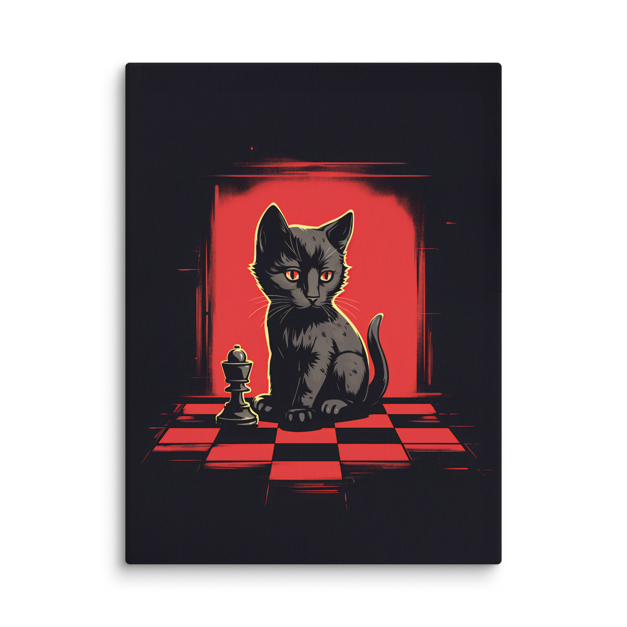Apportez une touche d’élégance et d’intrigue à votre intérieur avec cette toile Pop Art intitulée « Chess & Cat. » Ce design captivant, en rouge et noir, met en scène un chat observant un jeu d’échecs, créant une ambiance à la fois sophistiquée et mystérieuse, parfaite pour les amateurs de style audacieux.