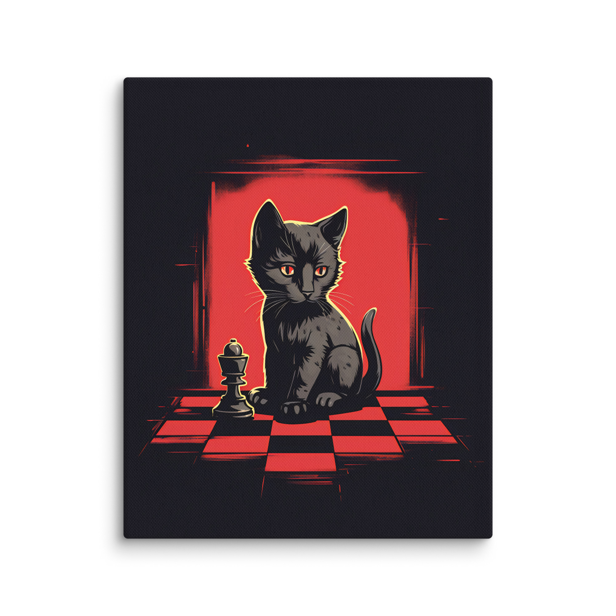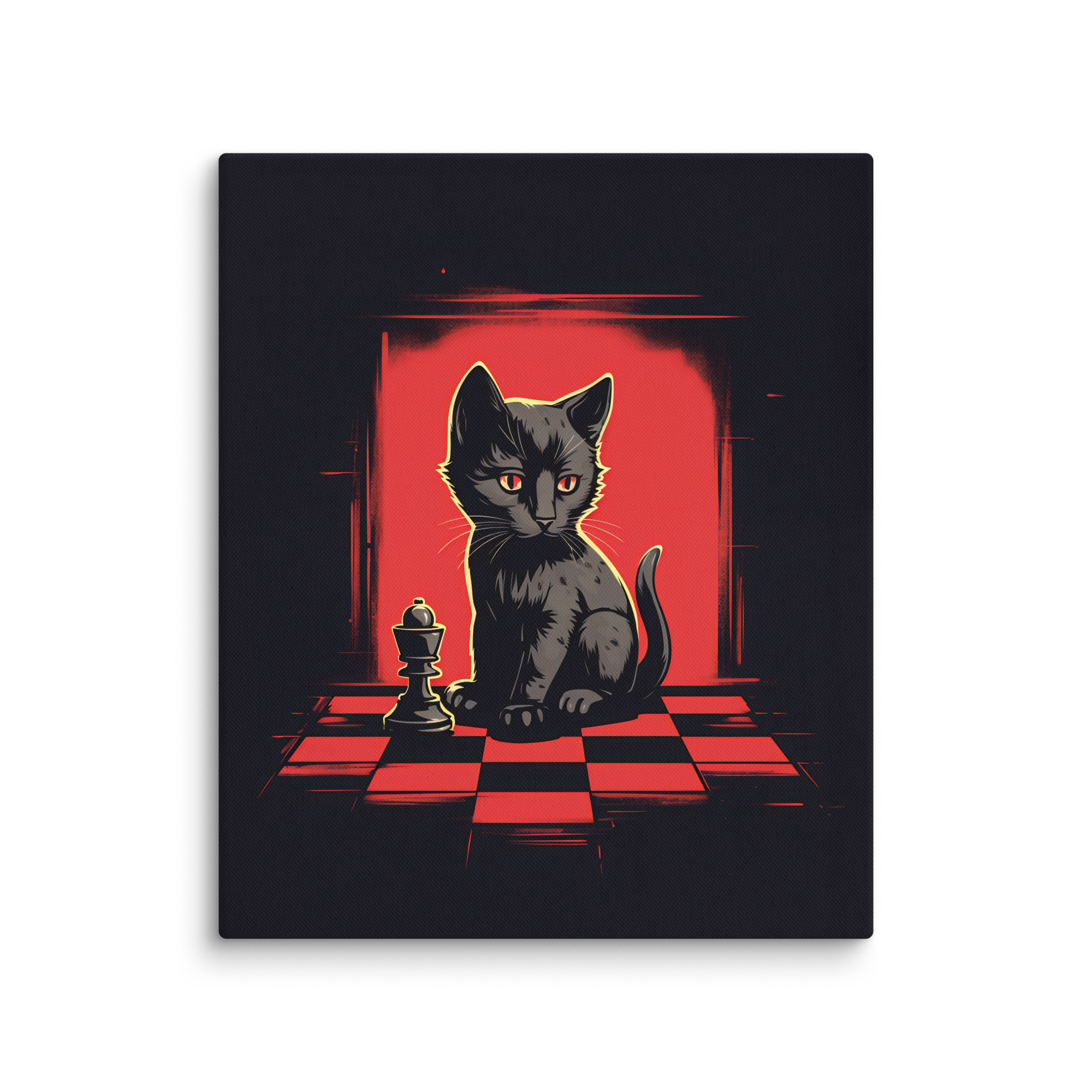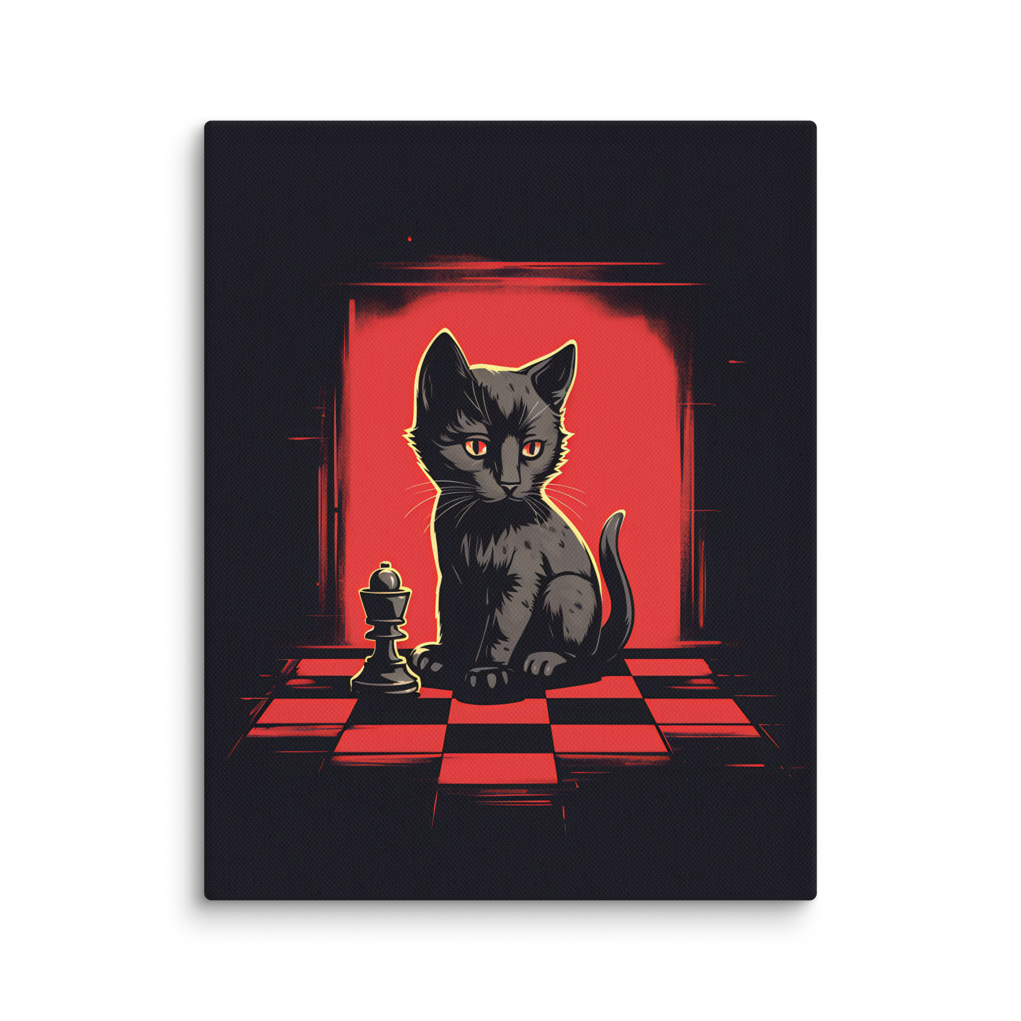Apportez une touche d’élégance et d’intrigue à votre intérieur avec cette toile Pop Art intitulée « Chess & Cat. » Ce design captivant, en rouge et noir, met en scène un chat observant un jeu d’échecs, créant une ambiance à la fois sophistiquée et mystérieuse, parfaite pour les amateurs de style audacieux.